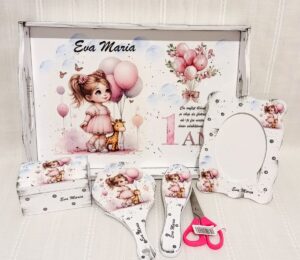 – set complet, care include tăviță, cutiuță pentru șuviță, perie de păr sau pieptănaș, oglinjoară de mână, ramă foto și forfecuț
