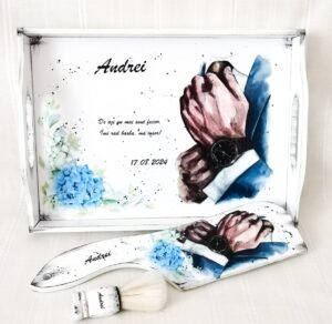 Setul pentru mire include tavă, satâr și pămătuf, toate realizate din lemn sau MDF.