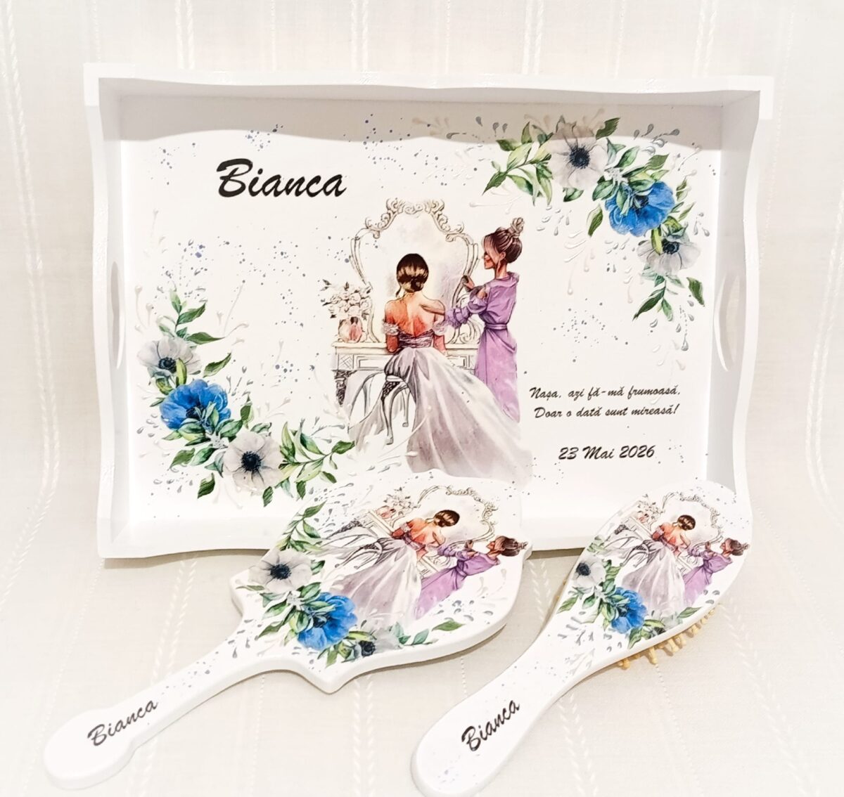 Setul pentru gătirea miresei cuprinde tavă, perie și oglindă, realizate din lemn sau MDF. Este folosit în ritualul de pregătire a miresei și oferă un plus de eleganță fotografiilor de nuntă.