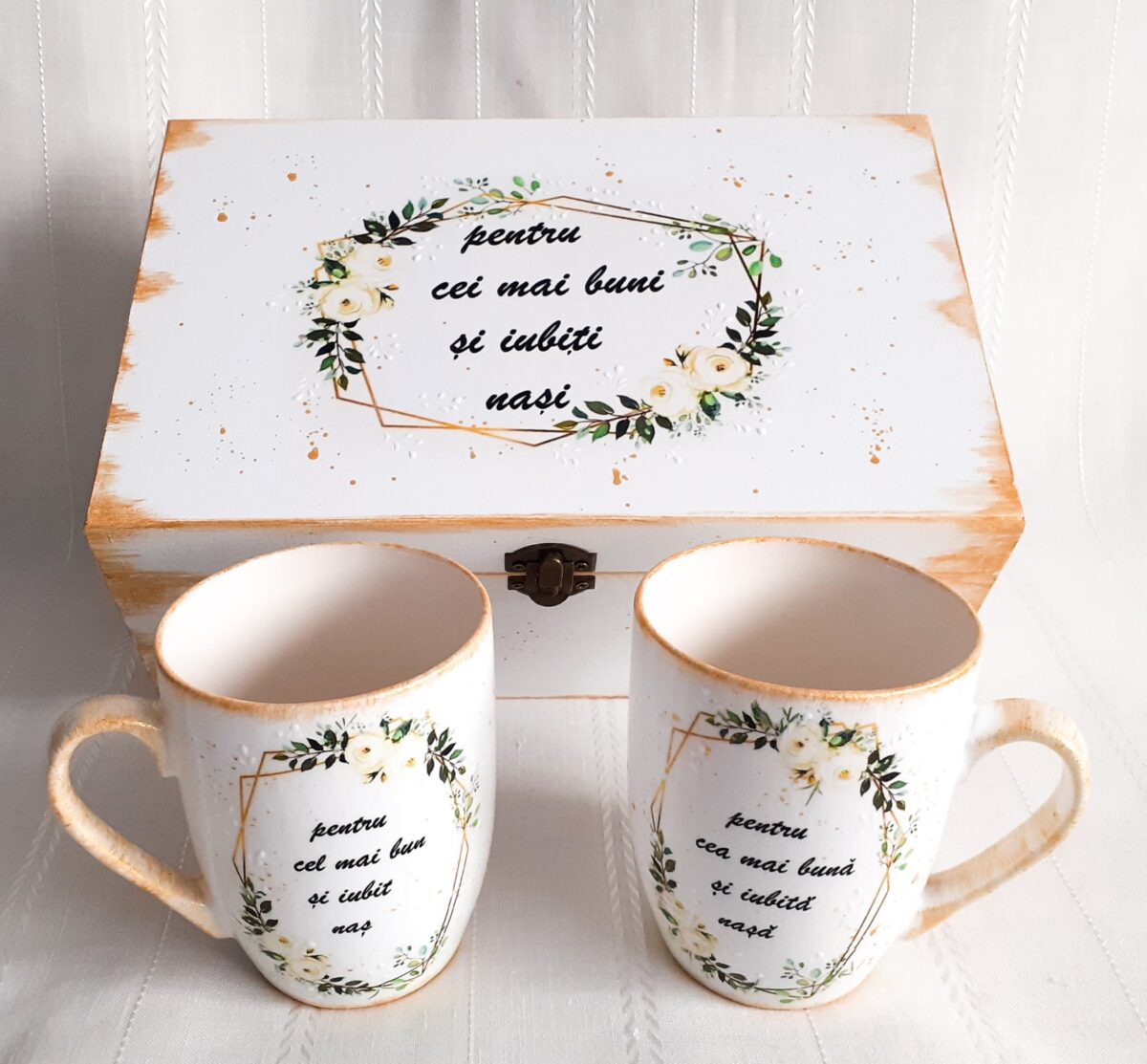 Fii primul care scrie o părere despre “Set 2 căni și cutie decorata manual, cu mesaj pentru nasi”