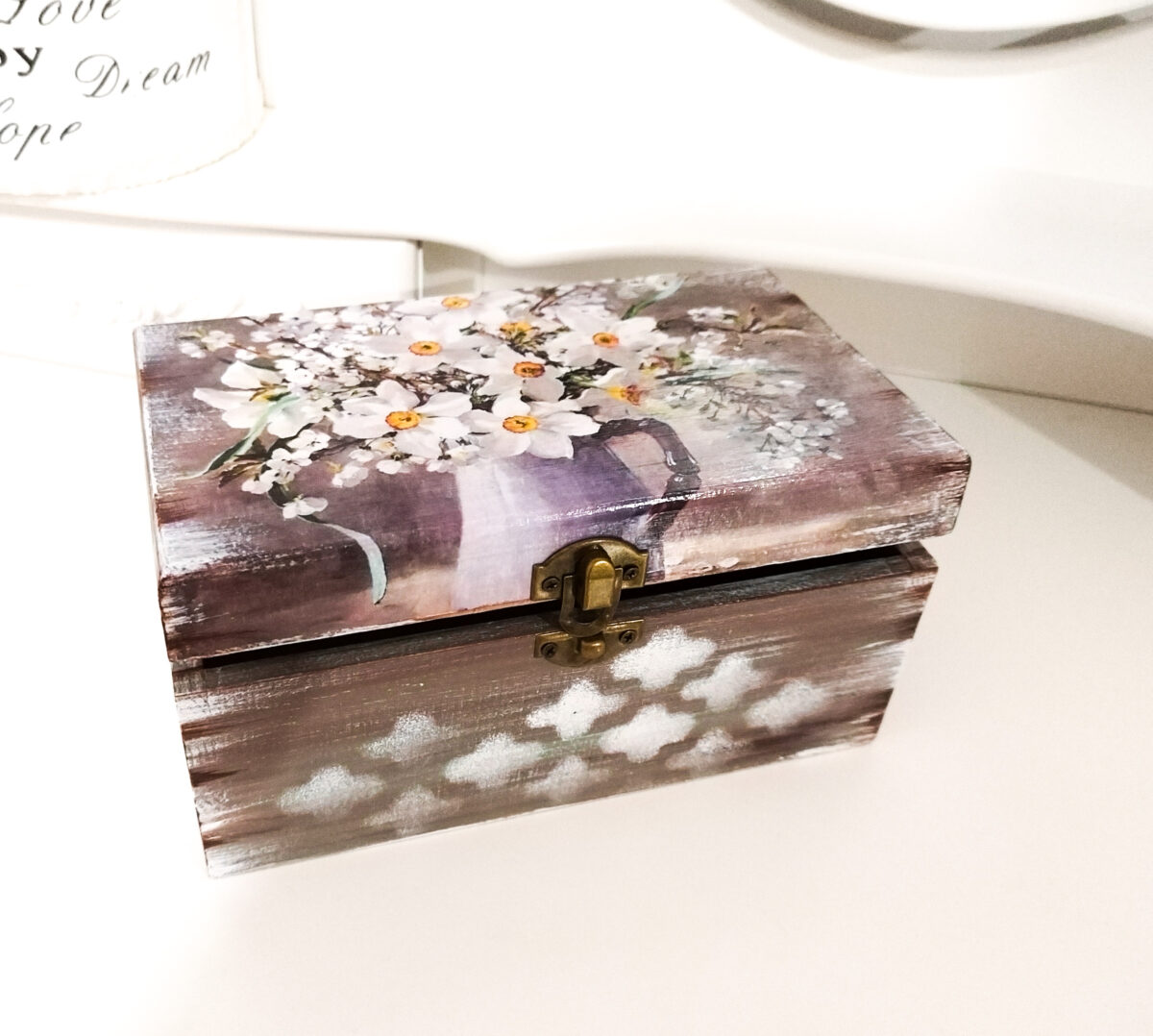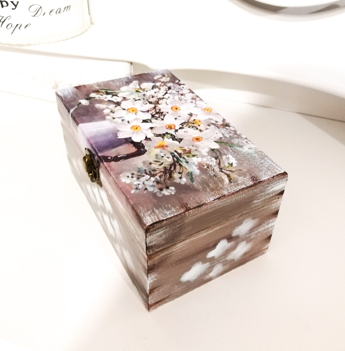 Cutiile sunt decorate cu vopsele acrilice, si lăcuite pentru o bună rezistență de-a lungul timpului. Tehnica de realizare este pictură basic si transfer de imagine.