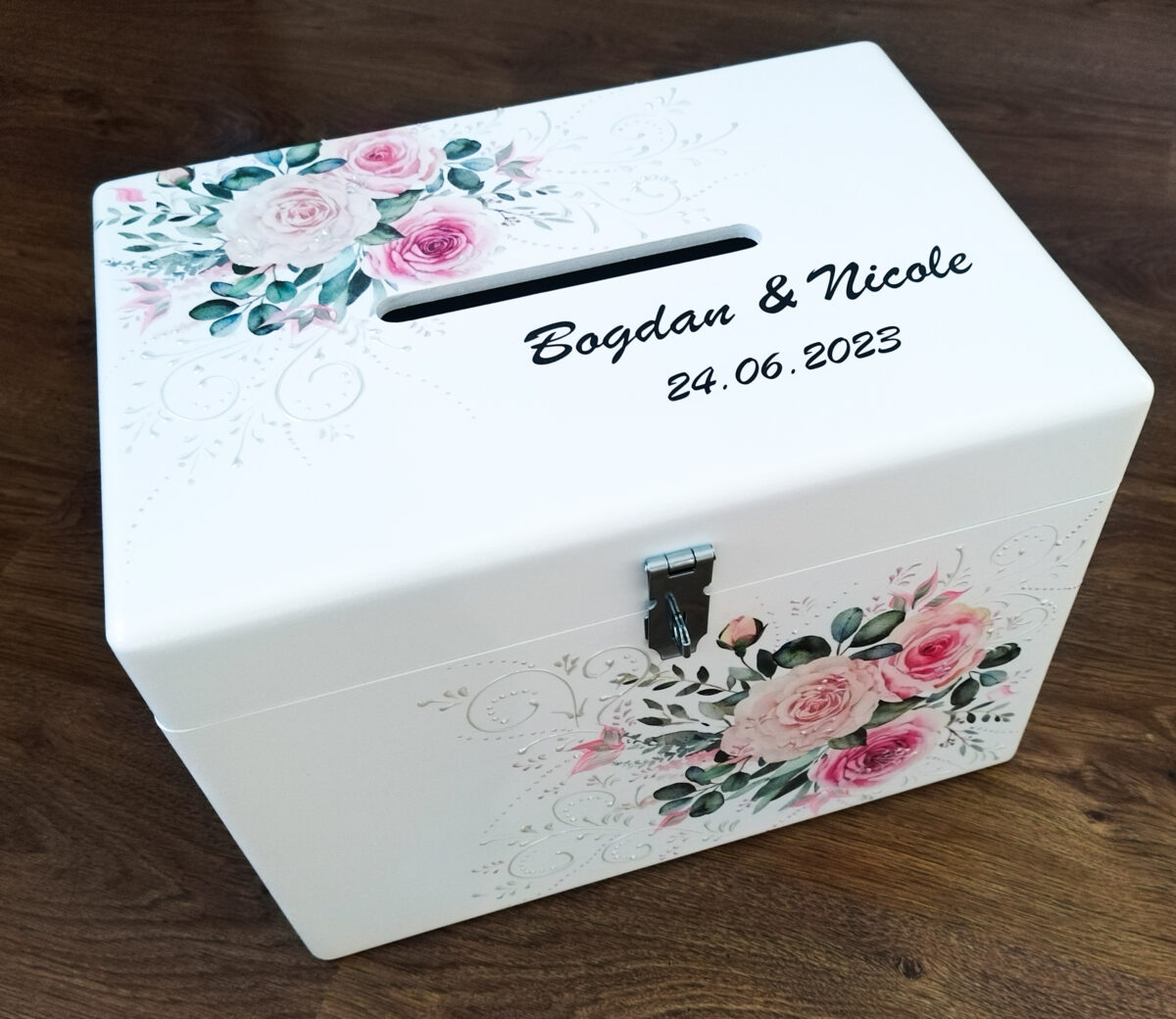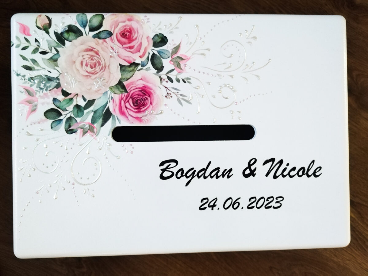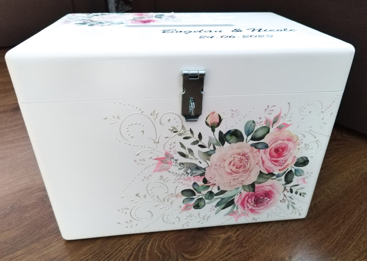 Cutie de dar pentru nuntă, destinată să completeze elegant decorul și tematica evenimentului. Finisajele de calitate și designul atent lucrat o transformă într-un obiect practic și decorativ.