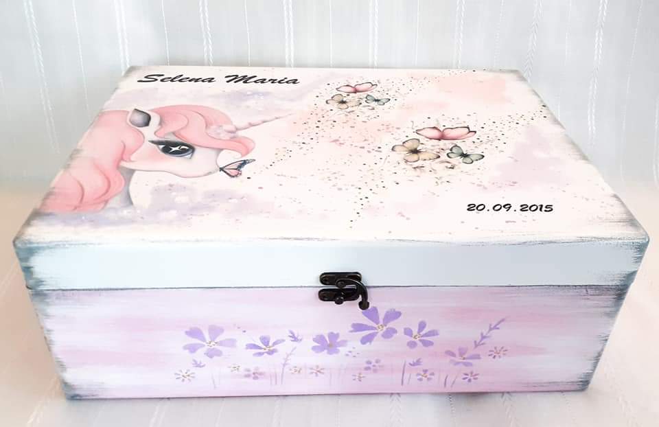 Produs decorat manual, personalizat în mod delicat si unic, creat special pentru a adăuga o nota de farmec evenimentului copilului tău. Cutia este din mdf decorată cu vopsele acrilice si bine lăcuită pentru rezistență la uzură, fără a-și modifica aspectul în timp. Tehnica de realizare este pictură basic si transfer de imagine. Poate fi folosită după eveniment pentru păstrarea amintirilor si lucrușoarelor prețioase de-a lungul anilor. Pentru că sunt realizate manual, reproducerea lor poate avea ușoare diferențe de nuanțe sau dimensionare a imaginilor.