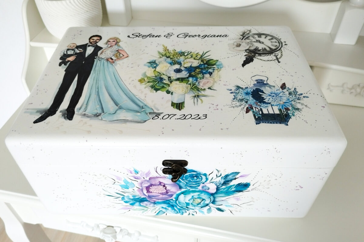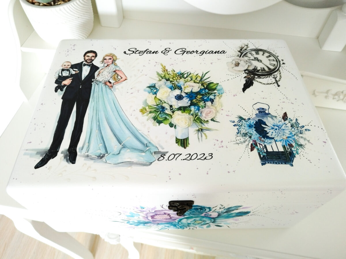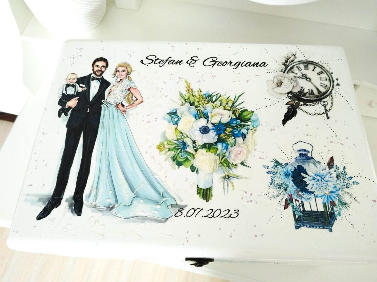 Produs decorat manual, personalizat în mod delicat si unic, creat special pentru a adăuga o nota de farmec evenimentului tău. Cutia este din mdf decorată cu vopsele acrilice si bine lăcuită pentru rezistență la uzură, fără a-și modifica aspectul în timp. Tehnica de realizare este pictură basic si transfer de imagine. Poate fi folosită după eveniment pentru păstrarea amintirilor si lucrușoarelor prețioase de-a lungul anilor. Pentru că sunt realizate manual, reproducerea lor poate avea ușoare diferențe de nuanțe sau dimensionare a imaginilor.