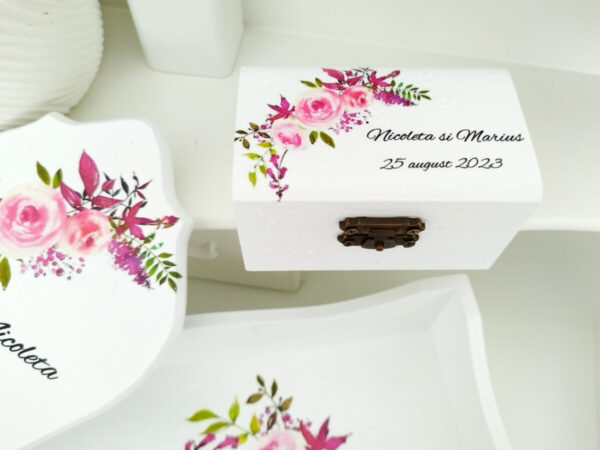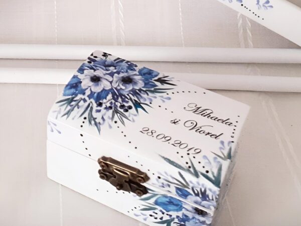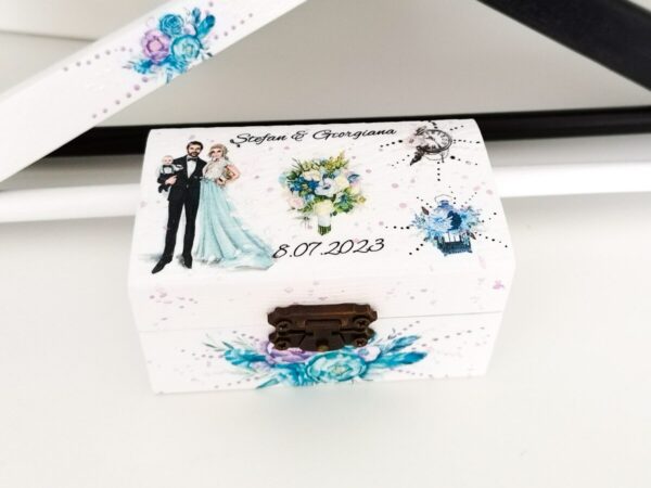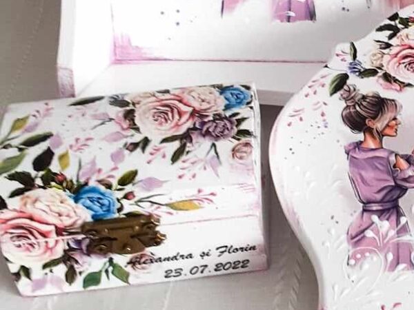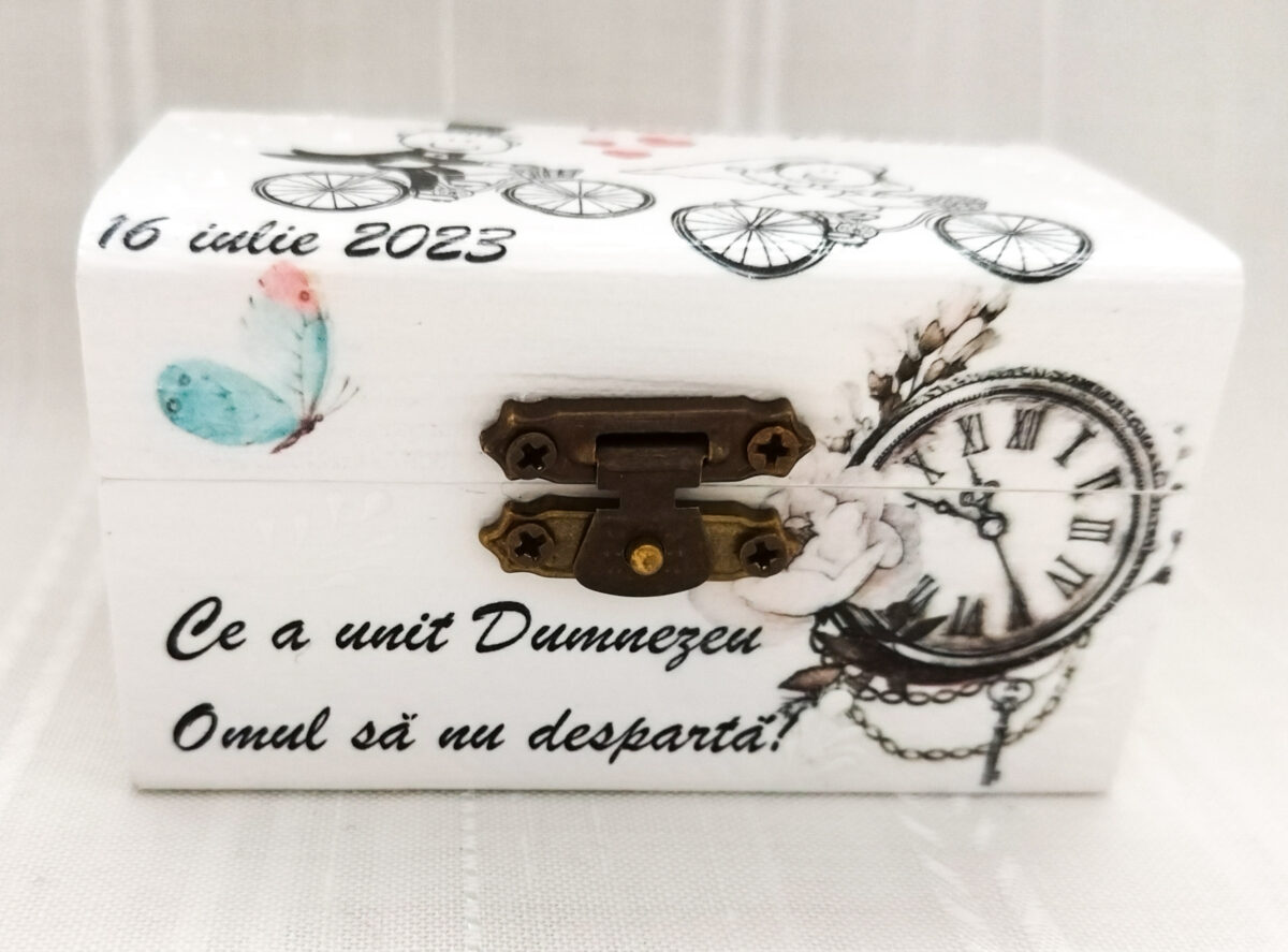 Cutiuța de verighete este personalizată si decorată manual. Tehnica de realizare este pictură basic si transfer de imagine. Ea se decorează conform cerințelor dumneavoastră, iar in interior conține pernuța si poate fi personalizata cu un mic text pe interiorul capacului.
