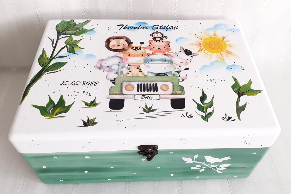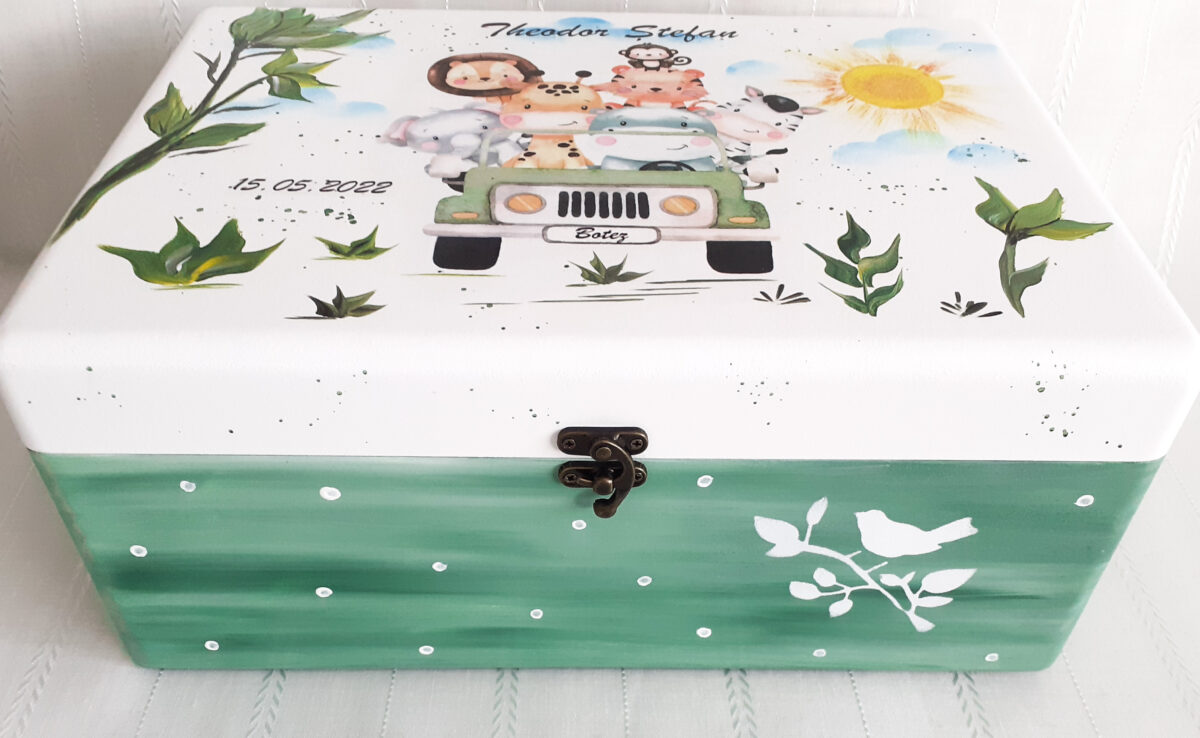 Produs decorat manual, personalizat în mod delicat si unic, creat special pentru a adăuga o nota de farmec evenimentului copilului tău. Cutia este din mdf decorată cu vopsele acrilice si bine lăcuită pentru rezistență la uzură, fără a-și modifica aspectul în timp. Tehnica de realizare este pictură basic si transfer de imagine. Poate fi folosită după eveniment pentru păstrarea amintirilor si lucrușoarelor prețioase de-a lungul anilor. Pentru că sunt realizate manual, reproducerea lor poate avea ușoare diferențe de nuanțe sau dimensionare a imaginilor.