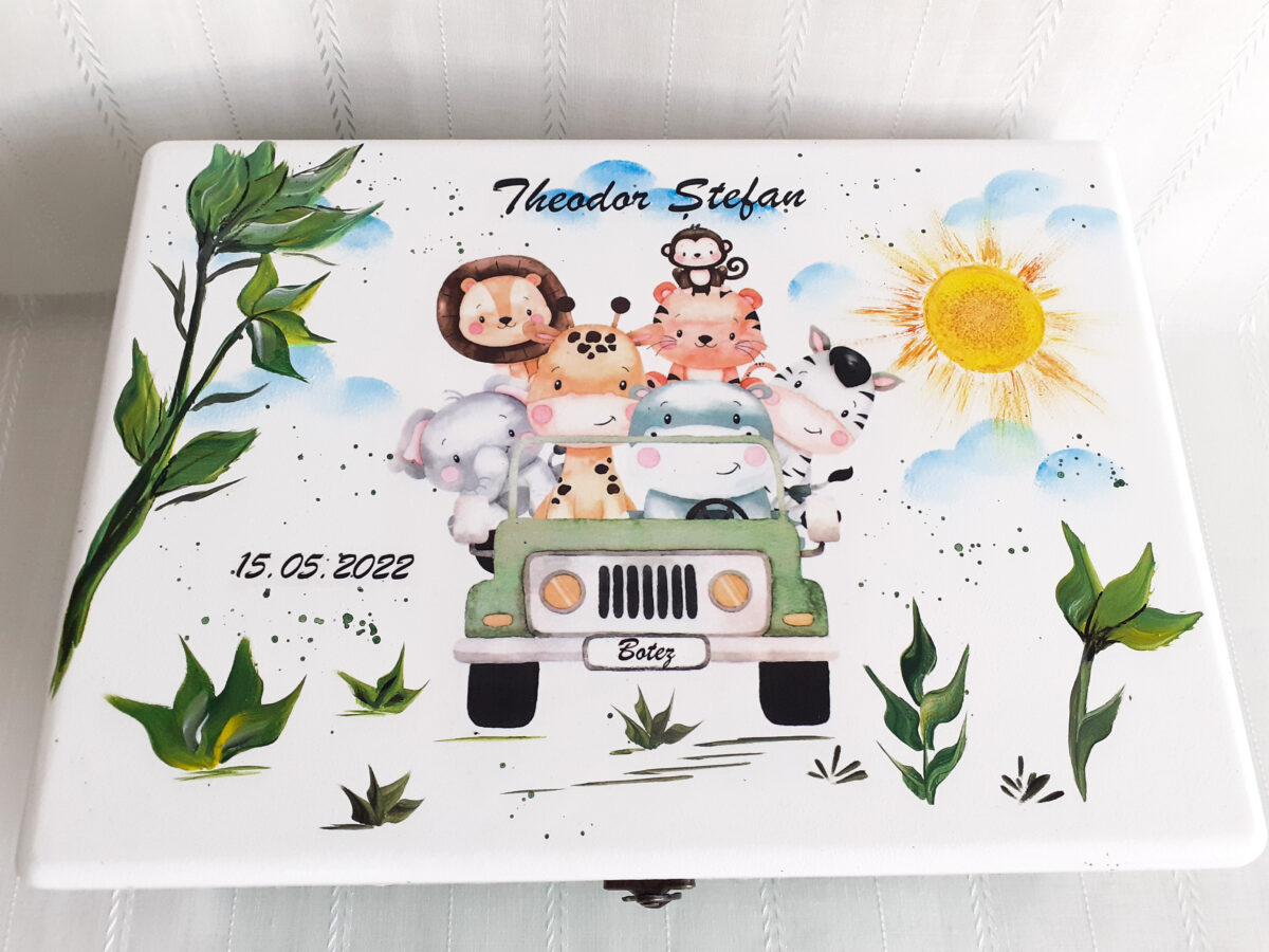 Cutia se personalizează cu numele copilului, text la alegere si data evenimentului. Detaliile le puteți lăsa la secțiunea personalizare produs sau ne puteți contacta direct pe telefon sau WhatsApp. Dacă doriți o altă tematică, de asemenea putem discuta.