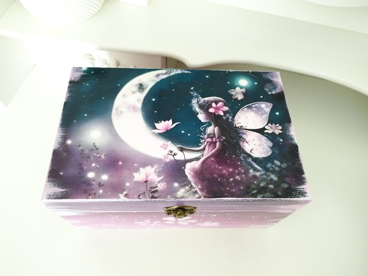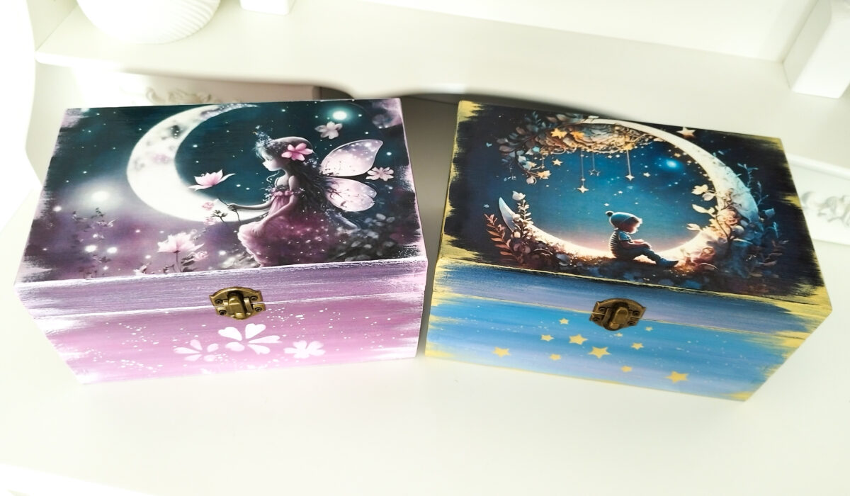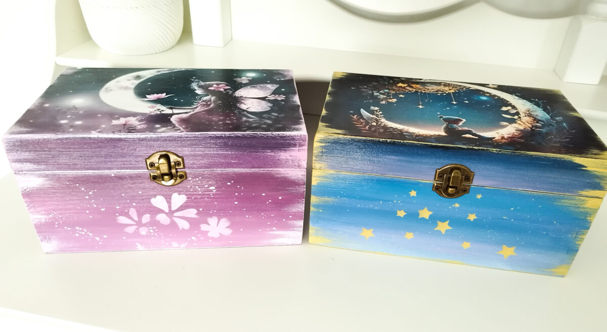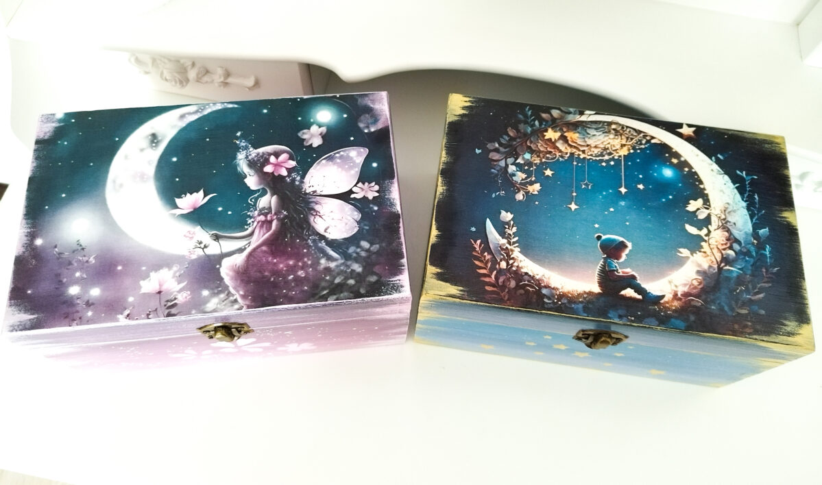 Cutiile sunt decorate cu vopsele acrilice, si lăcuite pentru o bună rezistență de-a lungul timpului. Tehnica de realizare este pictură basic si transfer de imagine.