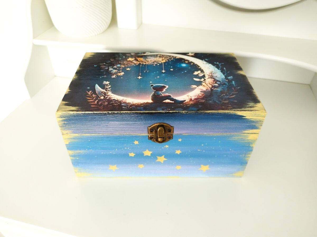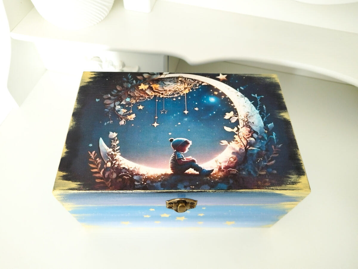 Cutie de amintiri personalizată, realizată pentru a adăuga un gest elegant și simbolic cadourilor oferite. Stilul rafinat și atenția la detalii o fac un obiect decorativ și util, perfect pentru păstrarea amintirilor.