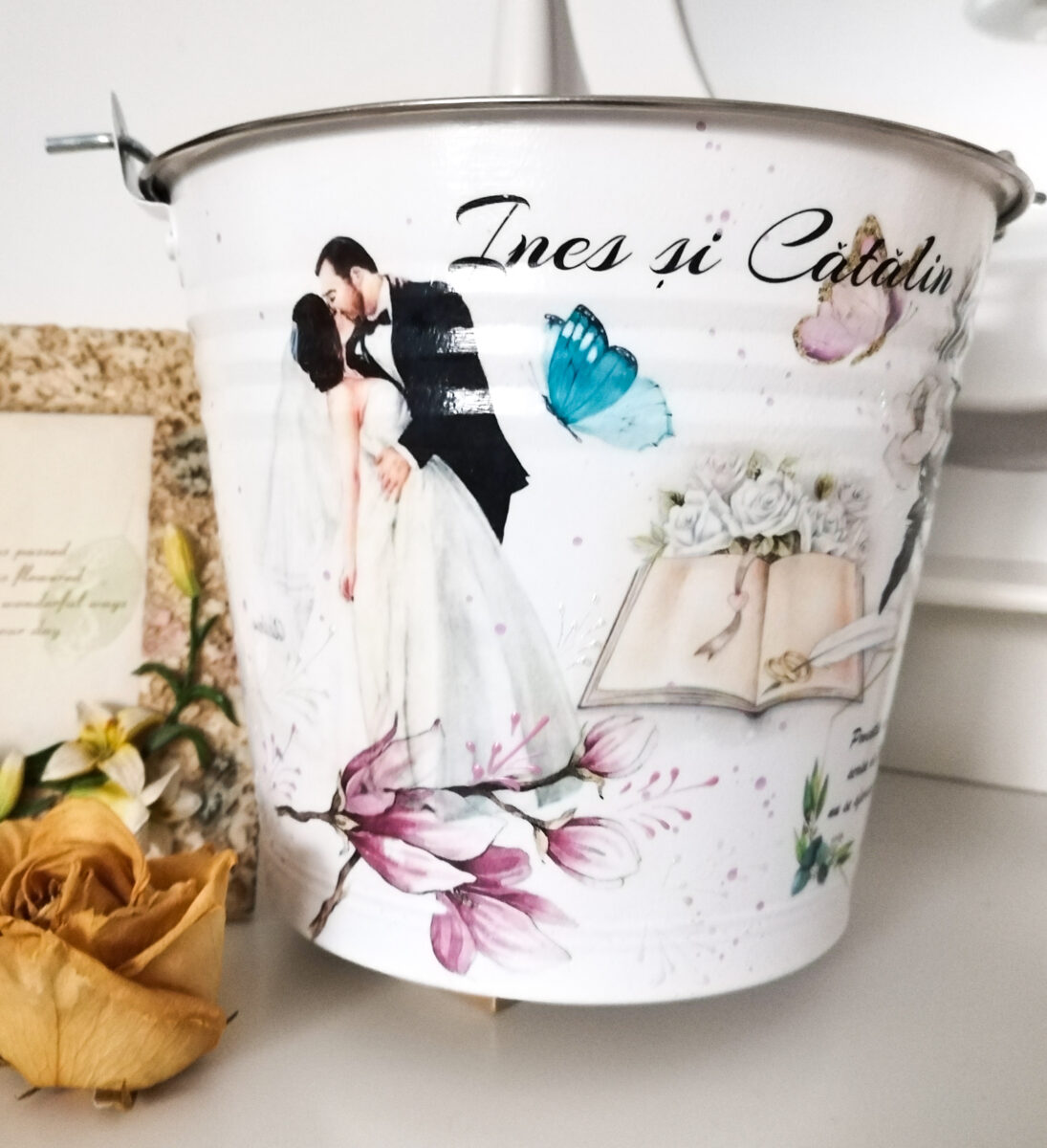 Găleata miresei este decorată de noi în tematica dorită, astfel încât evenimentul dvs sa aibă toate punctele bifate, să completeze unicitatea momentului și chiar sa atragă privirile invitaților dvs. Tehnica de realizare este pictură basic, transfer de imagine și lăcuire/sigilare finală pentru a fi utilizate și întreținute fără probleme prin spălare ușoară cu apă și detergent de vase, folosind o lavetă moale. Pentru că sunt realizate manual, reproducerea lor poate avea ușoare diferențe de nuanțe sau dimensionare a imaginilor.