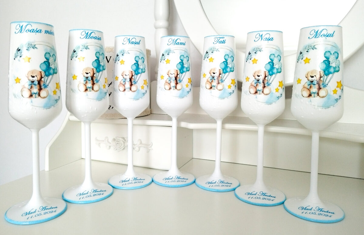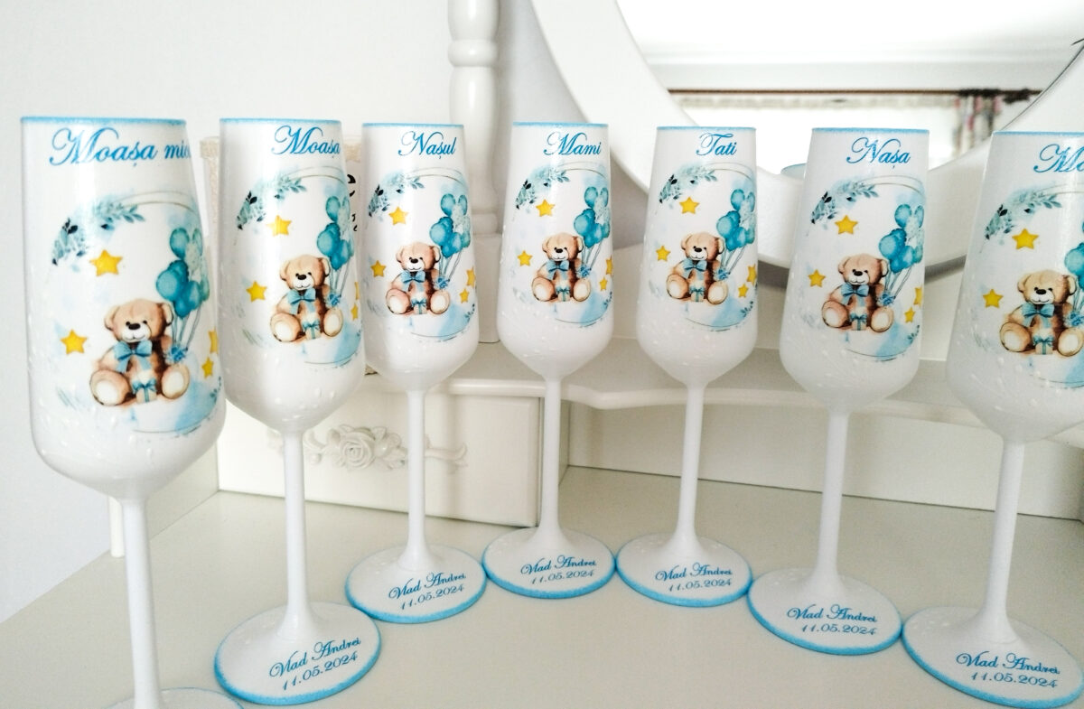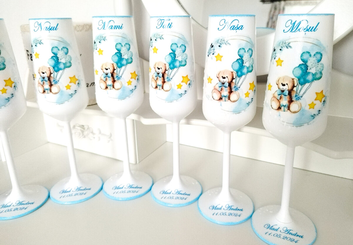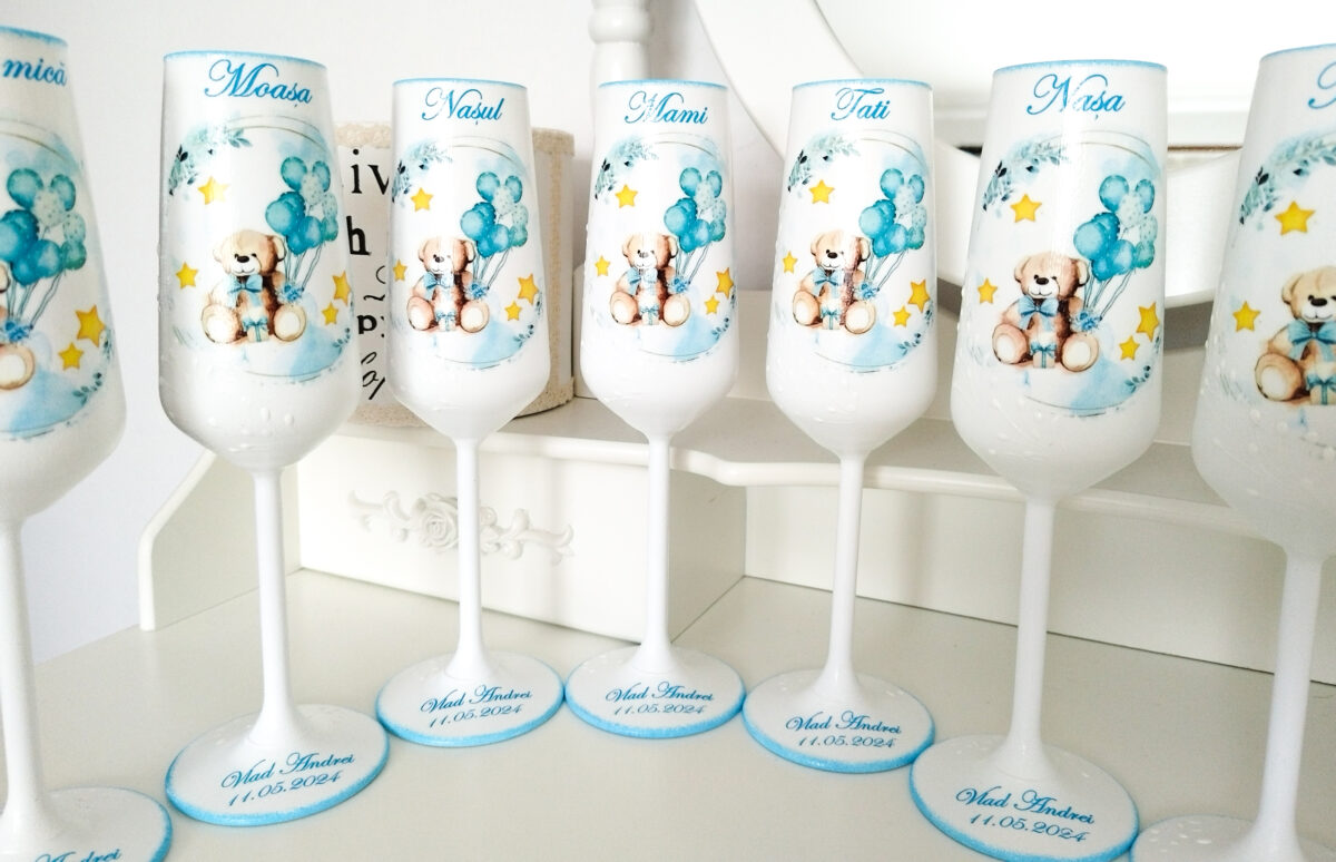 Paharele sunt nelipsite de la orice eveniment. Noi facem ca evenimentul tău să fie cu adevărat special prin paharele delicat decorate și personalizate cu multă atenție conform tematicii evenimentului. Tehnica de realizare este pictură basic, transfer de imagine și lăcuire/sigilare finală pentru a fi utilizate și întreținute fără probleme prin spălare ușoară cu apă și detergent de vase, folosind o lavetă moale.