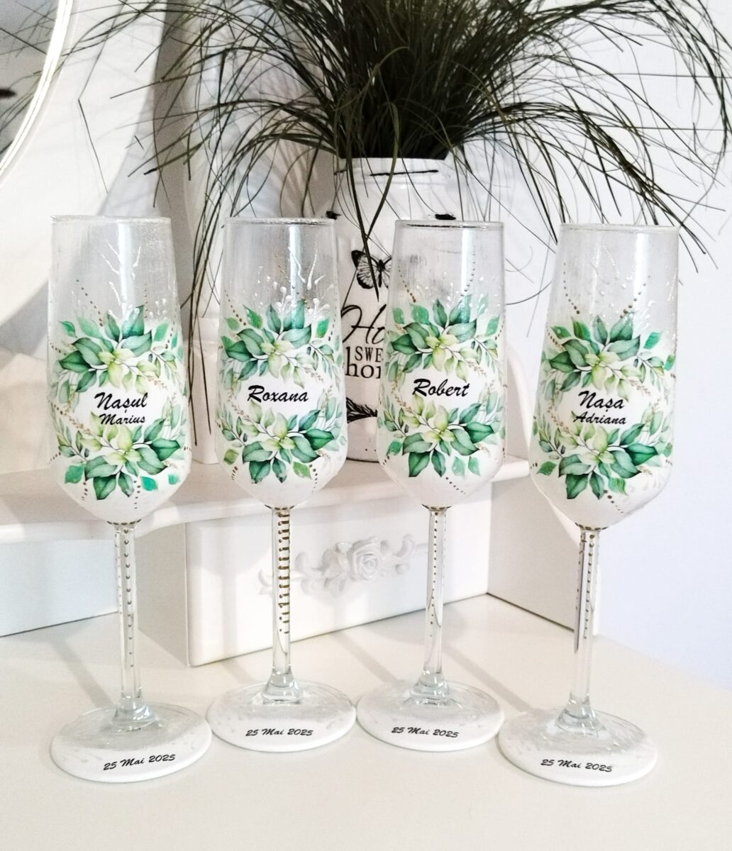 Paharele sunt nelipsite de la orice eveniment. Noi facem ca evenimentul tău să fie cu adevărat special prin paharele delicat decorate și personalizate cu multă atenție conform tematicii evenimentului. Tehnica de realizare este pictură basic, transfer de imagine și lăcuire/sigilare finală pentru a fi utilizate și întreținute fără probleme prin spălare ușoară cu apă și detergent de vase, folosind o lavetă moale.