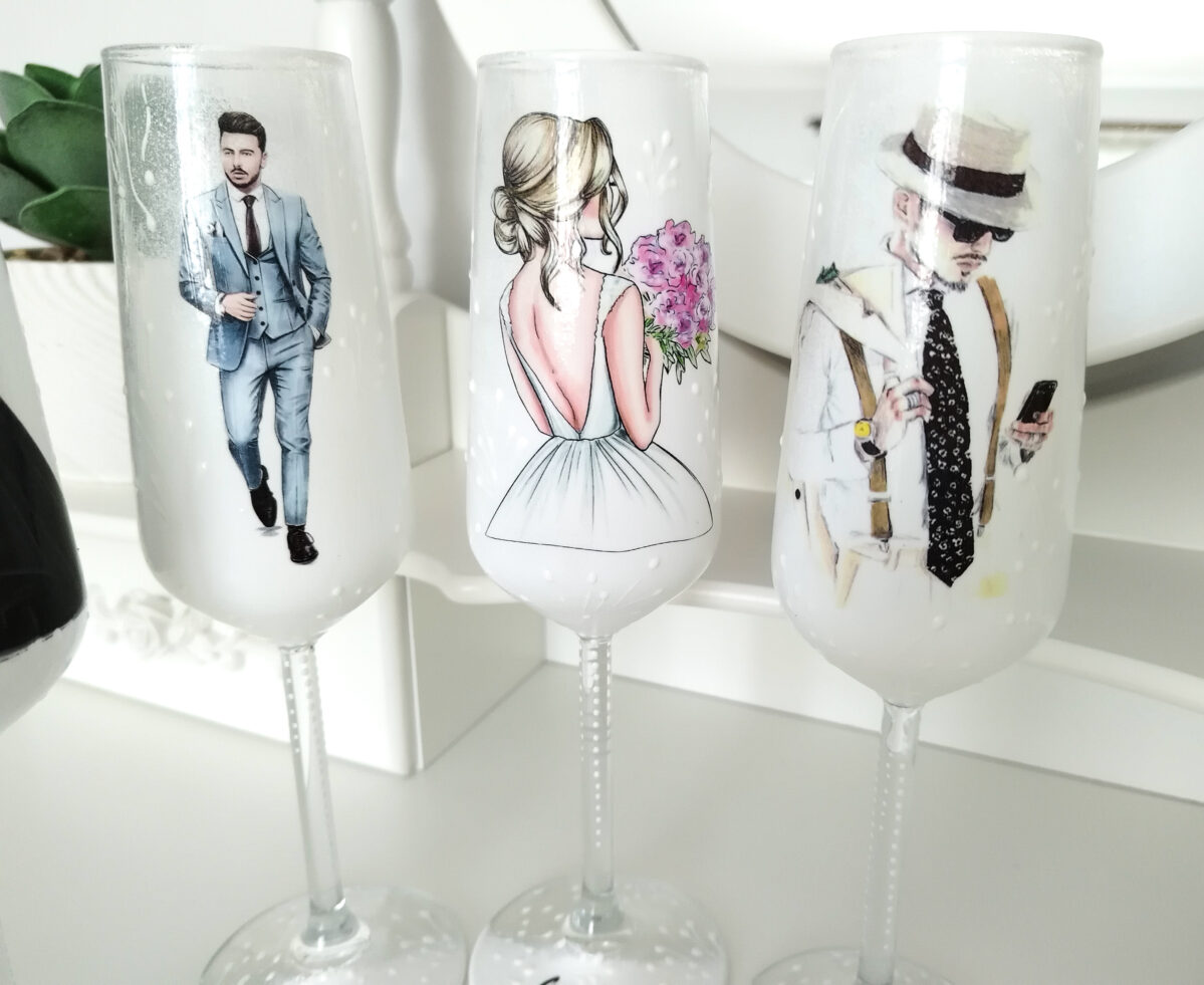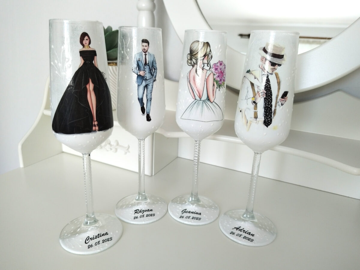 Paharele se personalizează cu numele și data evenimentului. Detaliile le puteți lăsa la secțiunea personalizare produs sau ne puteți contacta direct pe telefon sau WhatsApp. Dacă doriți o altă tematică putem discuta.