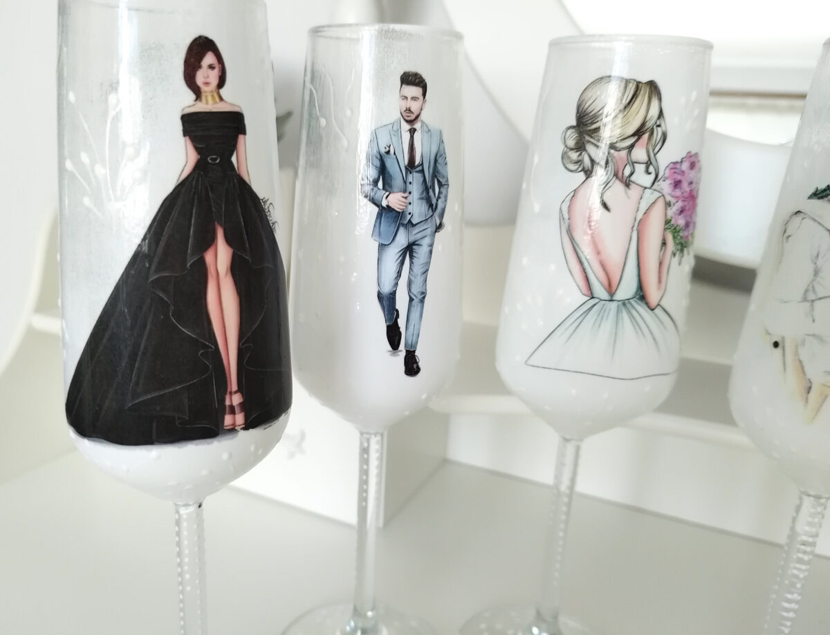 Paharele sunt nelipsite de la orice eveniment. Noi facem ca evenimentul tău să fie cu adevărat special prin paharele delicat decorate și personalizate cu multă atenție conform tematicii evenimentului. Tehnica de realizare este pictură basic, transfer de imagine și lăcuire/sigilare finală pentru a fi utilizate și întreținute fără probleme prin spălare ușoară cu apă și detergent de vase, folosind o lavetă moale.