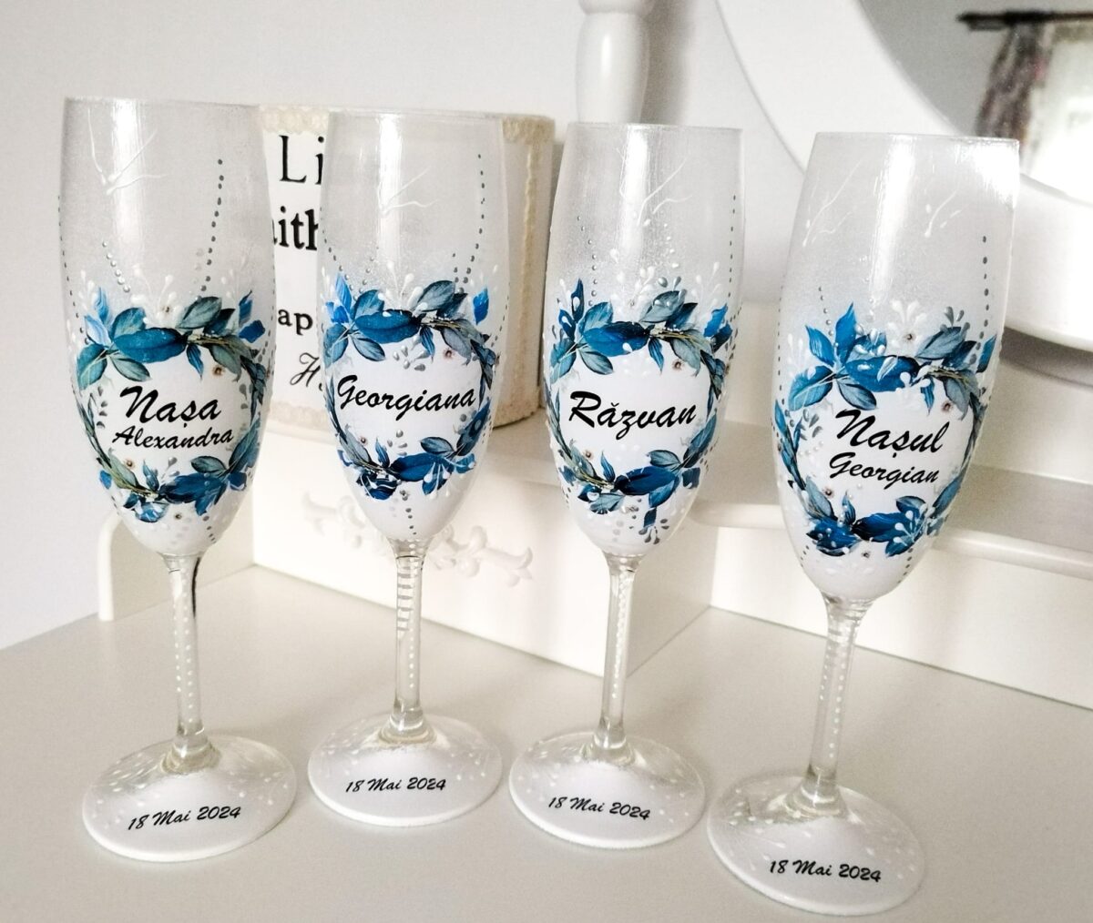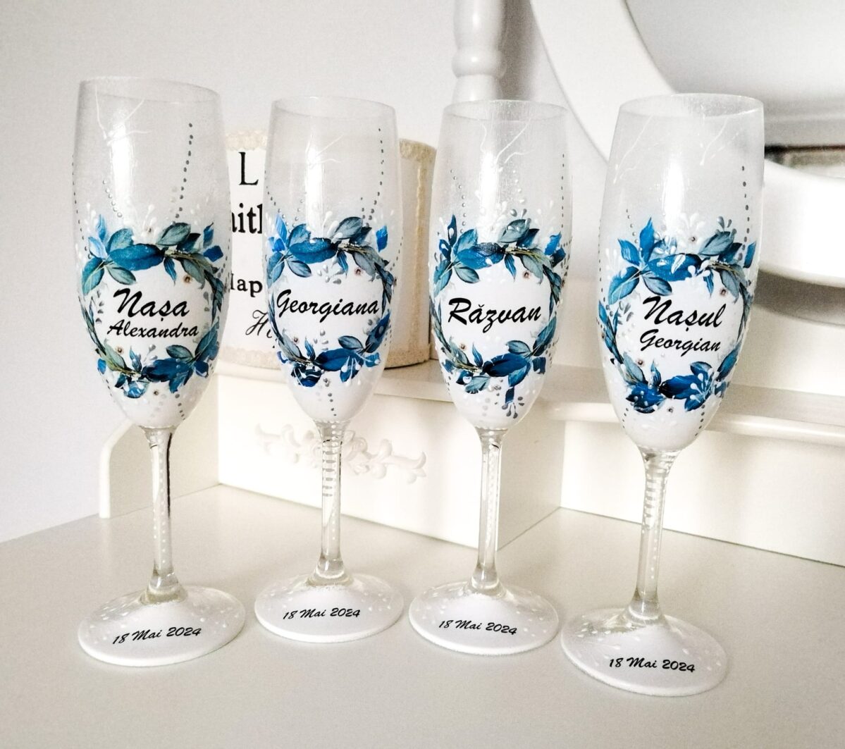 Pahare de nuntă decorate manual, rafinate și elegante, care completează masa mirilor și atmosfera ceremoniei. Ideale pentru fotografii memorabile și păstrare ca suvenir.