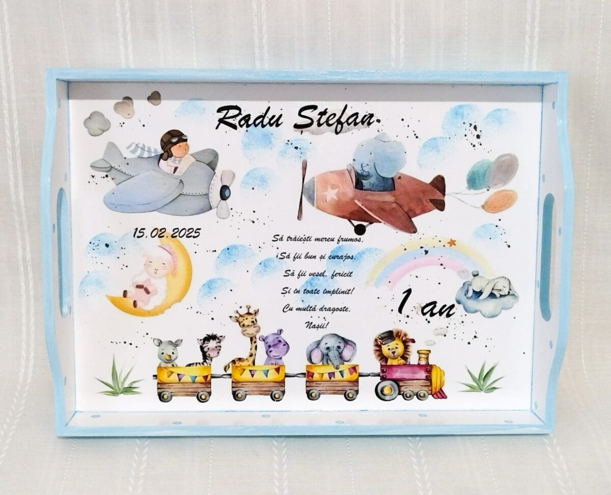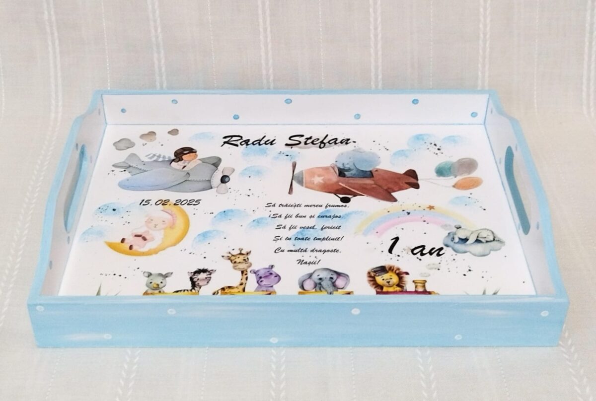 Produs decorat manual, personalizat în mod delicat si unic, creat special pentru a adăuga o nota de farmec evenimentului copilului tău. Piesele sunt din lemn/mdf, decorate cu vopsele pe bază de apa, si lăcuite pentru protecție si rezistentă în timp. Tehnica de realizare este pictură basic si transfer de imagine. Produsele sunt bine finisate, nu se îngălbenesc si sunt rezistente la uzura normală. Pentru că sunt realizate manual, reproducerea lor poate avea ușoare diferențe de nuanțe sau dimensionare a imaginilor.