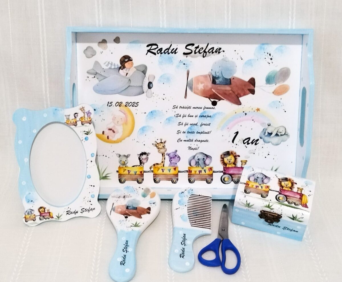 Setul conține tava, cutiuță pentru șuviță, perie/pieptănaș, oglindă de mână, ramă foto si forfecuț.