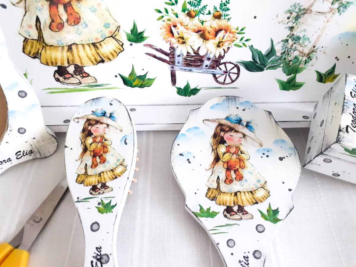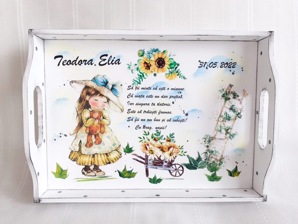 Produs decorat manual, personalizat în mod delicat si unic, creat special pentru a adăuga o nota de farmec evenimentului copilului tău. Piesele sunt din lemn/mdf, decorate cu vopsele pe bază de apa, si lăcuite pentru protecție si rezistentă în timp. Tehnica de realizare este pictură basic si transfer de imagine. Produsele sunt bine finisate, nu se îngălbenesc si sunt rezistente la uzura normală. Pentru că sunt realizate manual, reproducerea lor poate avea ușoare diferențe de nuanțe sau dimensionare a imaginilor.