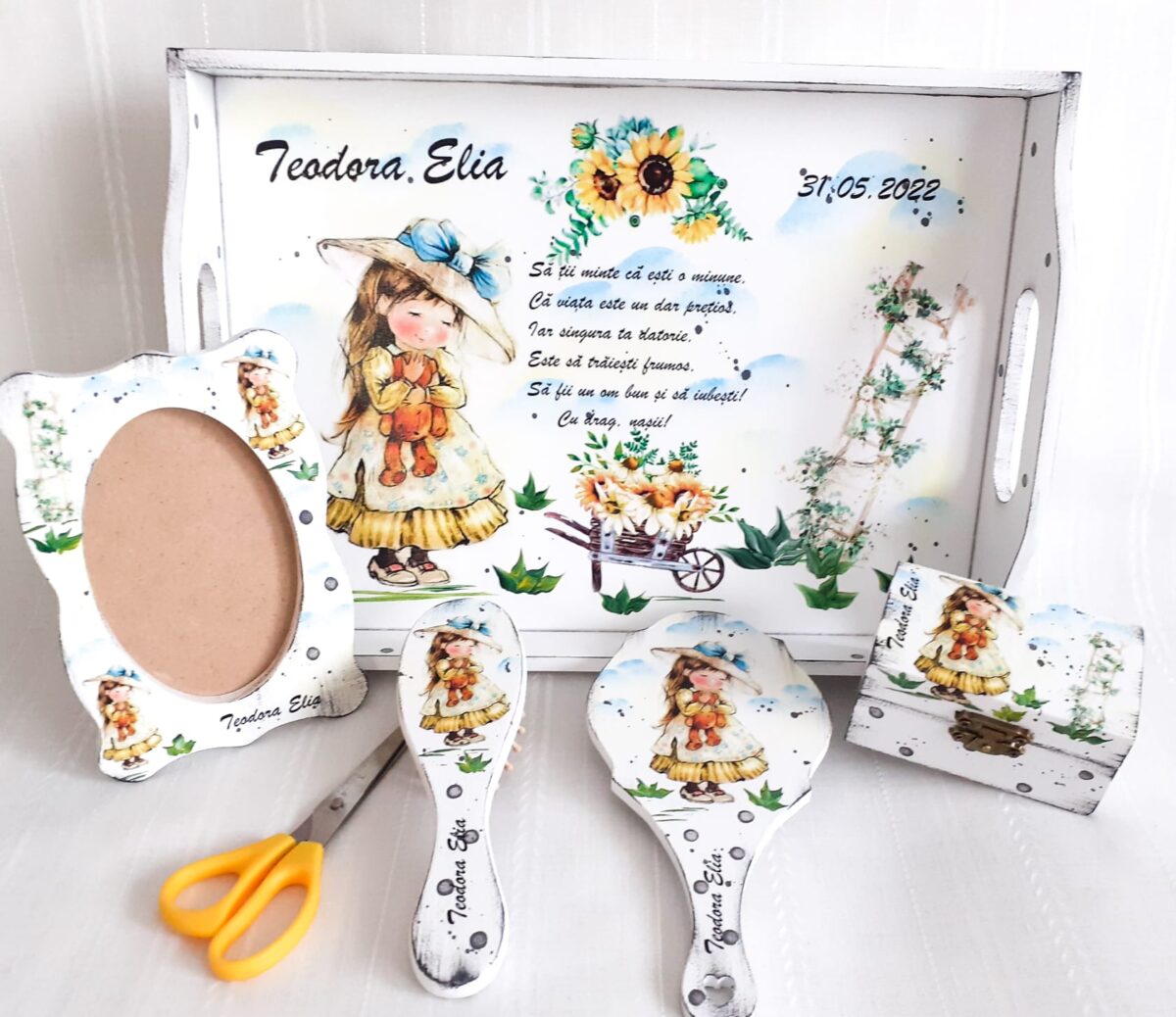 Setul conține tava, cutiuță pentru șuviță, perie/pieptănaș, oglindă de mână, ramă foto si forfecuț.