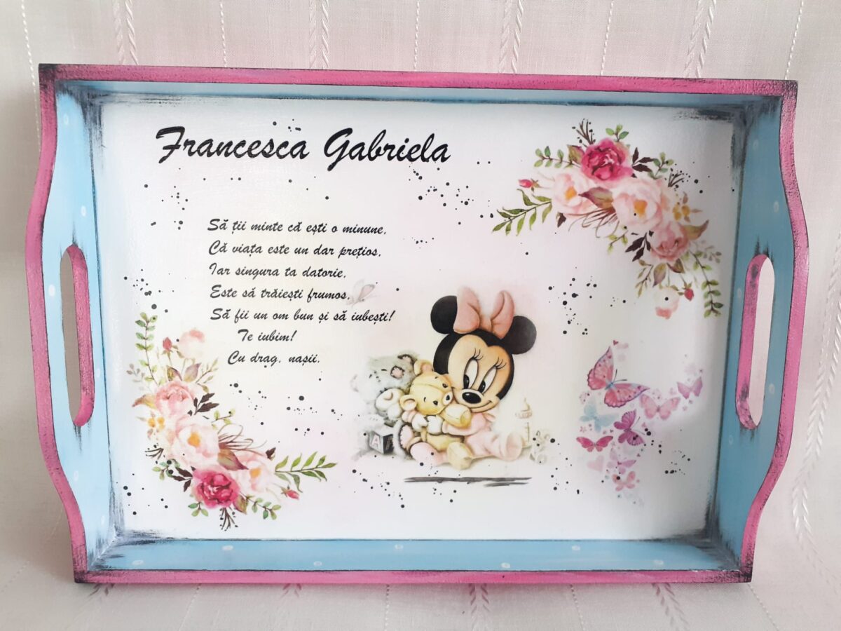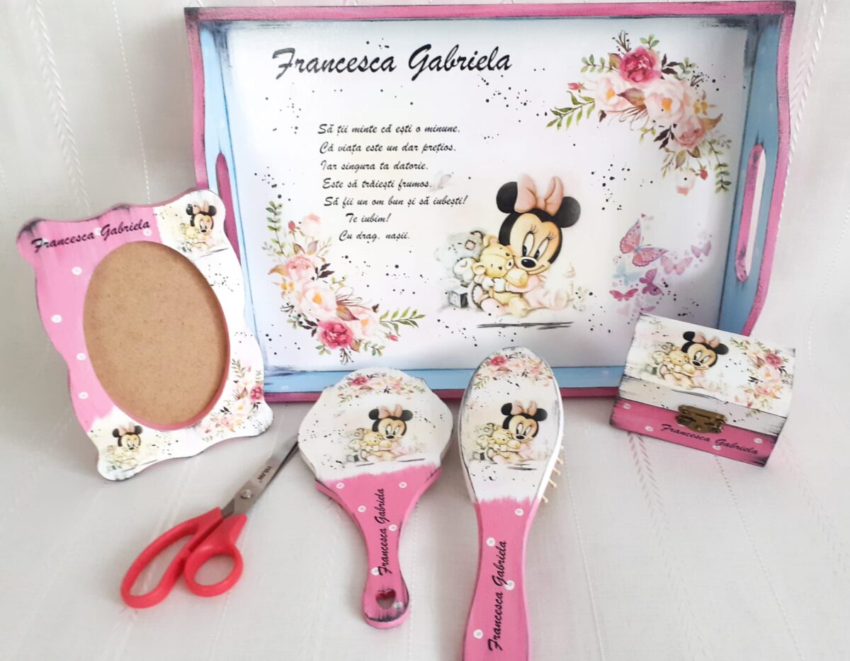 Produs decorat manual, personalizat în mod delicat si unic, creat special pentru a adăuga o nota de farmec evenimentului copilului tău. Piesele sunt din lemn/mdf, decorate cu vopsele pe bază de apa, si lăcuite pentru protecție si rezistentă în timp. Tehnica de realizare este pictură basic si transfer de imagine. Produsele sunt bine finisate, nu se îngălbenesc si sunt rezistente la uzura normală. Pentru că sunt realizate manual, reproducerea lor poate avea ușoare diferențe de nuanțe sau dimensionare a imaginilor.
