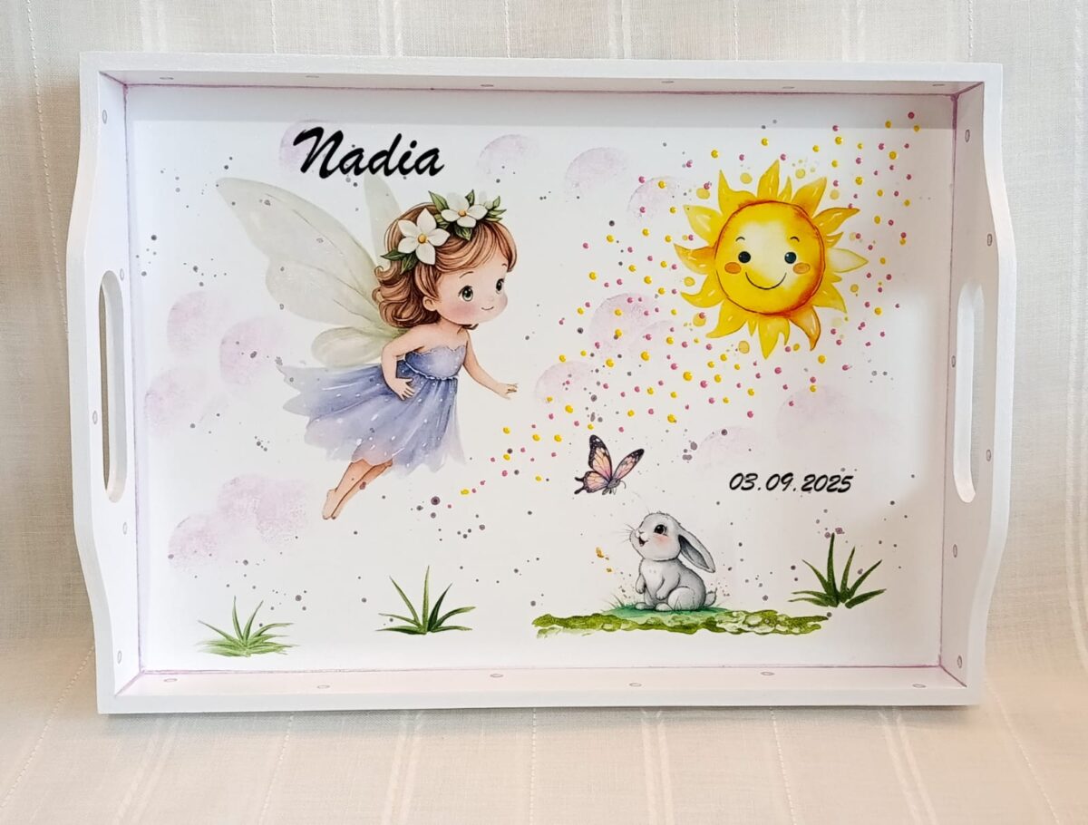 Produs decorat manual, personalizat în mod delicat si unic, creat special pentru a adăuga o nota de farmec evenimentului copilului tău. Piesele sunt din lemn/mdf, decorate cu vopsele pe bază de apa, si lăcuite pentru protecție si rezistentă în timp. Tehnica de realizare este pictură basic si transfer de imagine. Produsele sunt bine finisate, nu se îngălbenesc si sunt rezistente la uzura normală. Pentru că sunt realizate manual, reproducerea lor poate avea ușoare diferențe de nuanțe sau dimensionare a imaginilor.