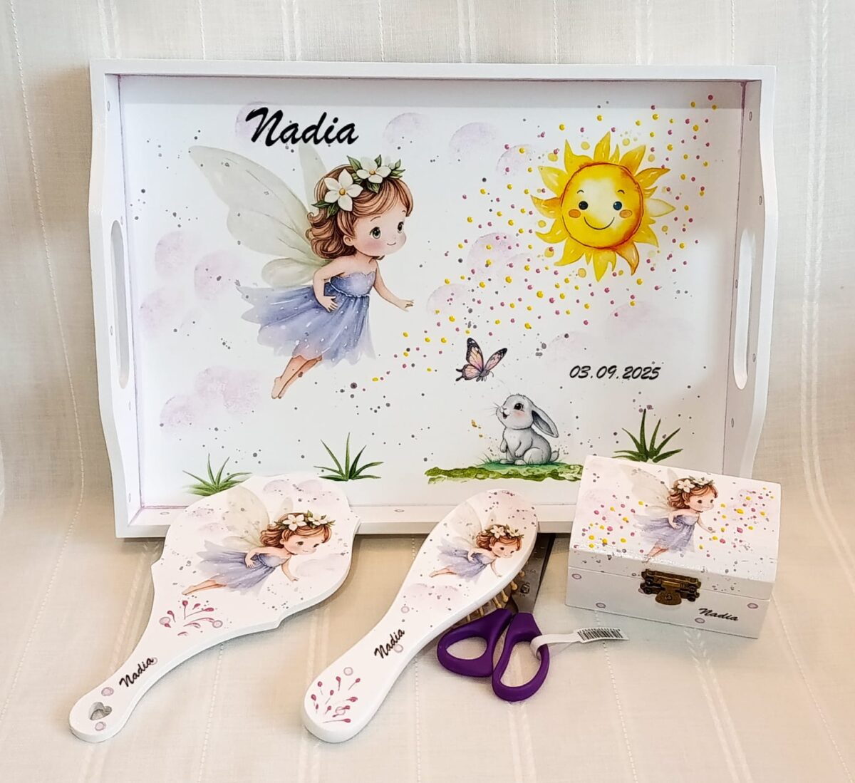 Setul conține tava, cutiuță pentru șuviță, perie/pieptănaș, oglindă de mână, ramă foto si forfecuț.