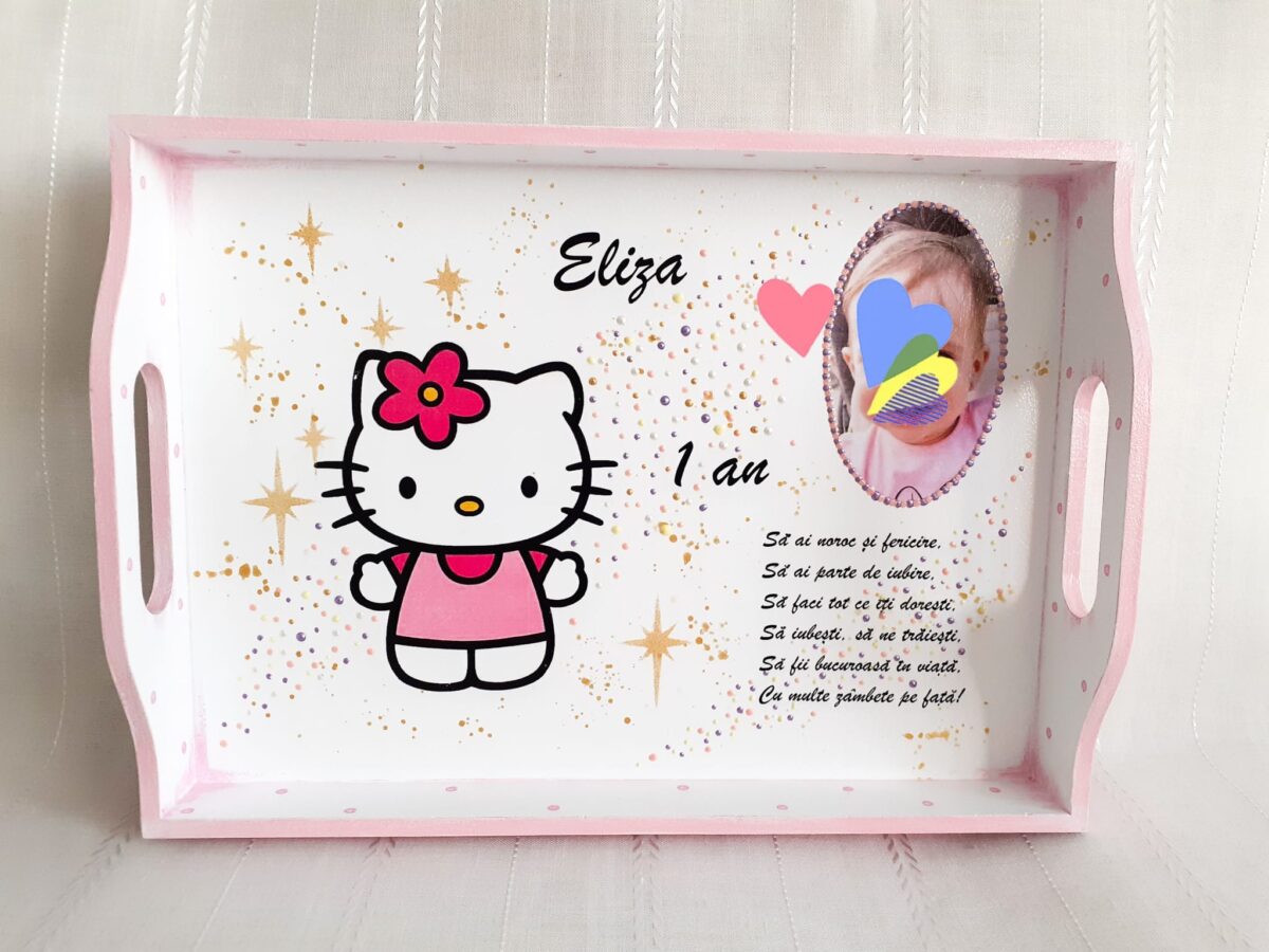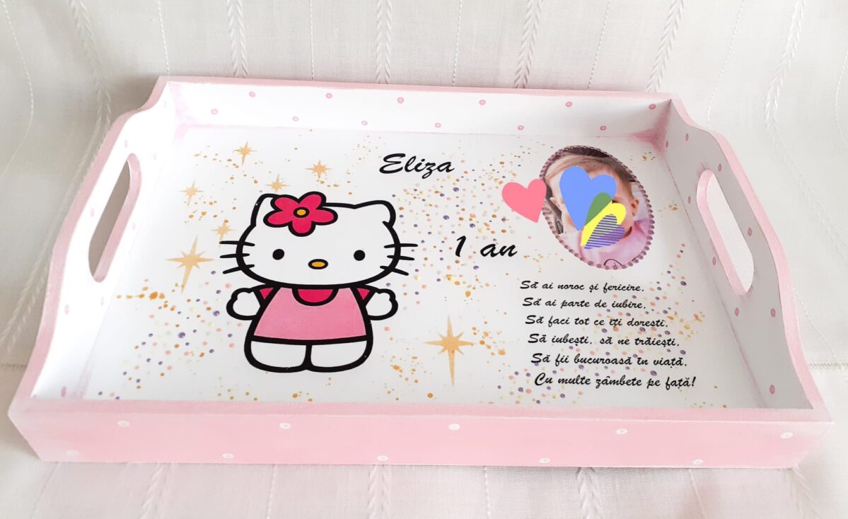 Produs decorat manual, personalizat în mod delicat si unic, creat special pentru a adăuga o nota de farmec evenimentului copilului tău. Piesele sunt din lemn/mdf, decorate cu vopsele pe bază de apa, si lăcuite pentru protecție si rezistentă în timp. Tehnica de realizare este pictură basic si transfer de imagine. Produsele sunt bine finisate, nu se îngălbenesc si sunt rezistente la uzura normală. Pentru că sunt realizate manual, reproducerea lor poate avea ușoare diferențe de nuanțe sau dimensionare a imaginilor.
