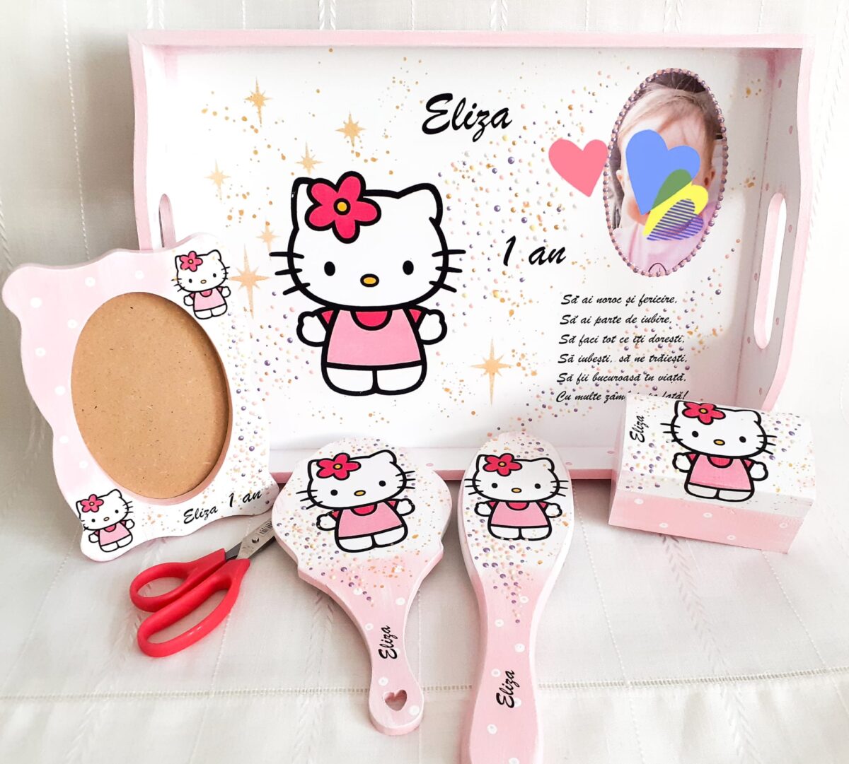 Setul conține tava, cutiuță pentru șuviță, perie/pieptănaș, oglindă de mână, ramă foto si forfecuț.